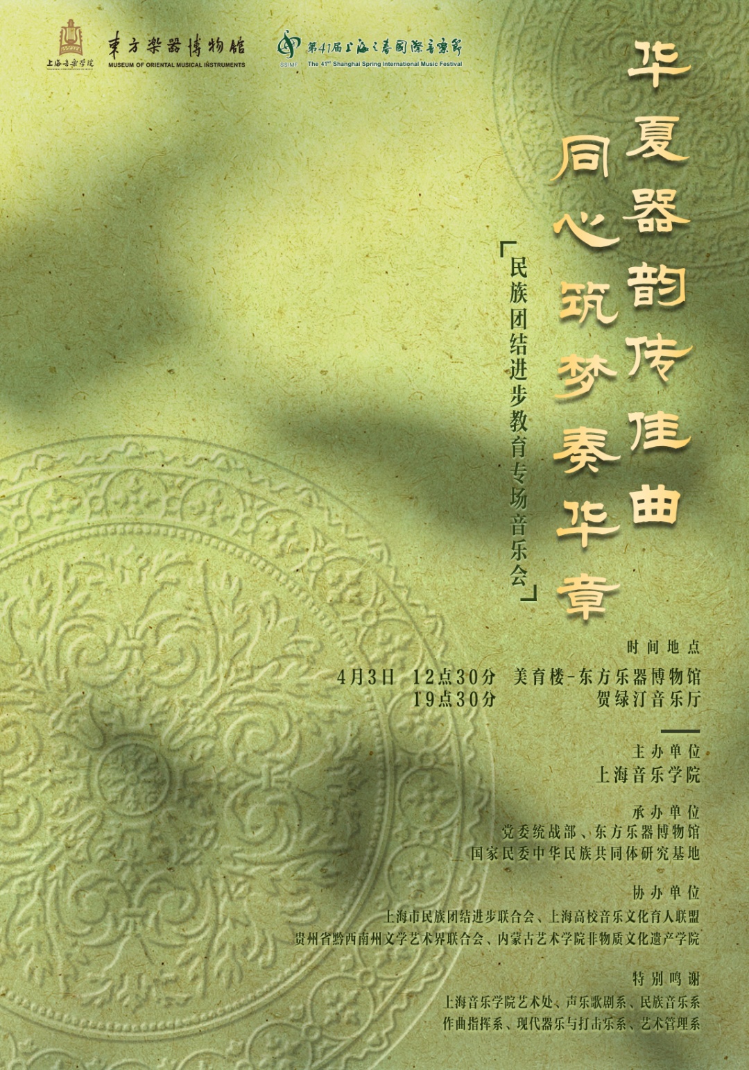 “华夏器韵传佳曲 同心筑梦奏华章”民族团结进步教育专场音乐会,是第41届上海之春国际音乐节主体演出项目之一。本场音乐会以中国多民族音乐文化为主要内容,汇集了打击乐、歌舞、器乐合奏、弹唱、合唱等多种表演形式。节目所涉地域广泛,涵盖云南、贵州、内蒙古、新疆、青海等地,所使用的乐器与表演形式亦各具特色。对观众而言,这既是一次较为集中的民族音乐展示,亦是在上海以音乐形式呈现与铸牢中华民族共同体意识的一次实践。