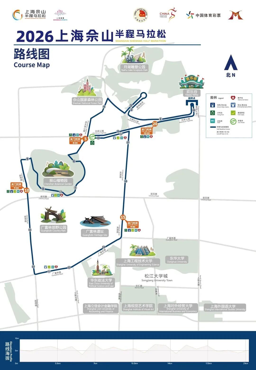赛事路线:(起点) 欢乐谷—景观大道—沈砖公路—外青松公路—林荫新路—外青松公路—佘天昆公路—辰山植物园内部路—佘天昆公路—辰塔路—广富林路—龙源路—沈砖公路(折返)—景观大道—欢乐谷(终点)