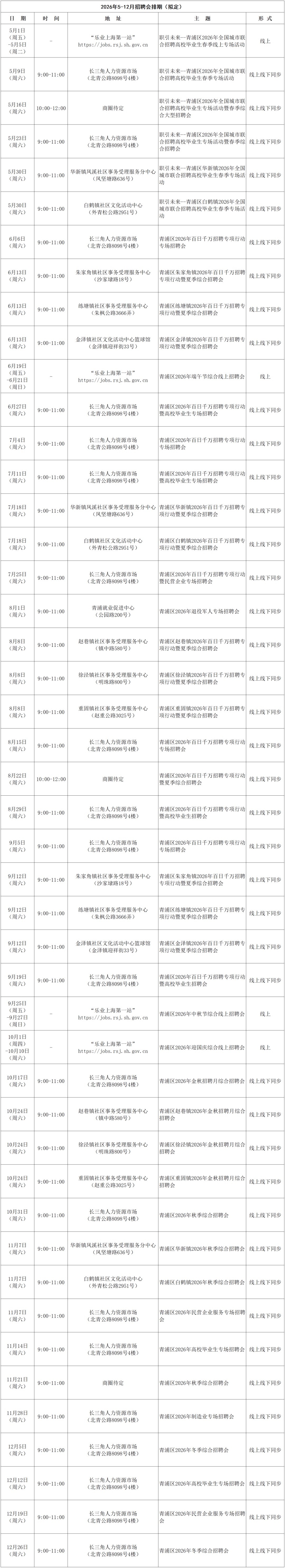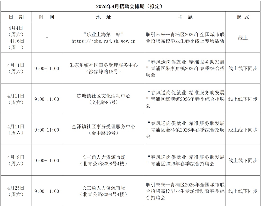 为全面贯彻党的二十届四中全会和十二届市委历次全会精神,贯彻落实党中央、国务院和市委、市政府关于稳就业工作的决策部署,坚持以人民为中心的发展思想,深入践行人民城市理念,积极做好春节前后劳动者稳岗留工、返岗促就业及企业用工保障工作,全力稳就业、保用工、优服务、促发展,青浦区人社局结合青浦区实际,2026年拟开展一系列线上线下社招活动,现将拟定排期公布如下: