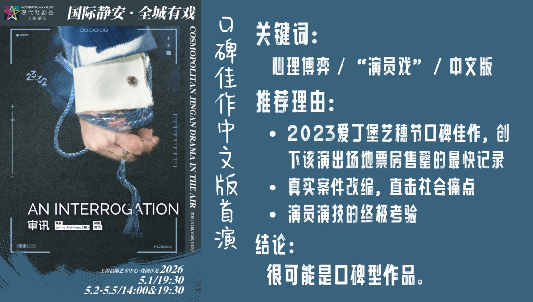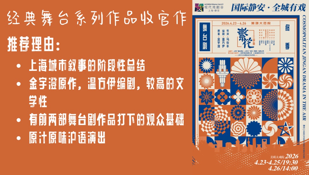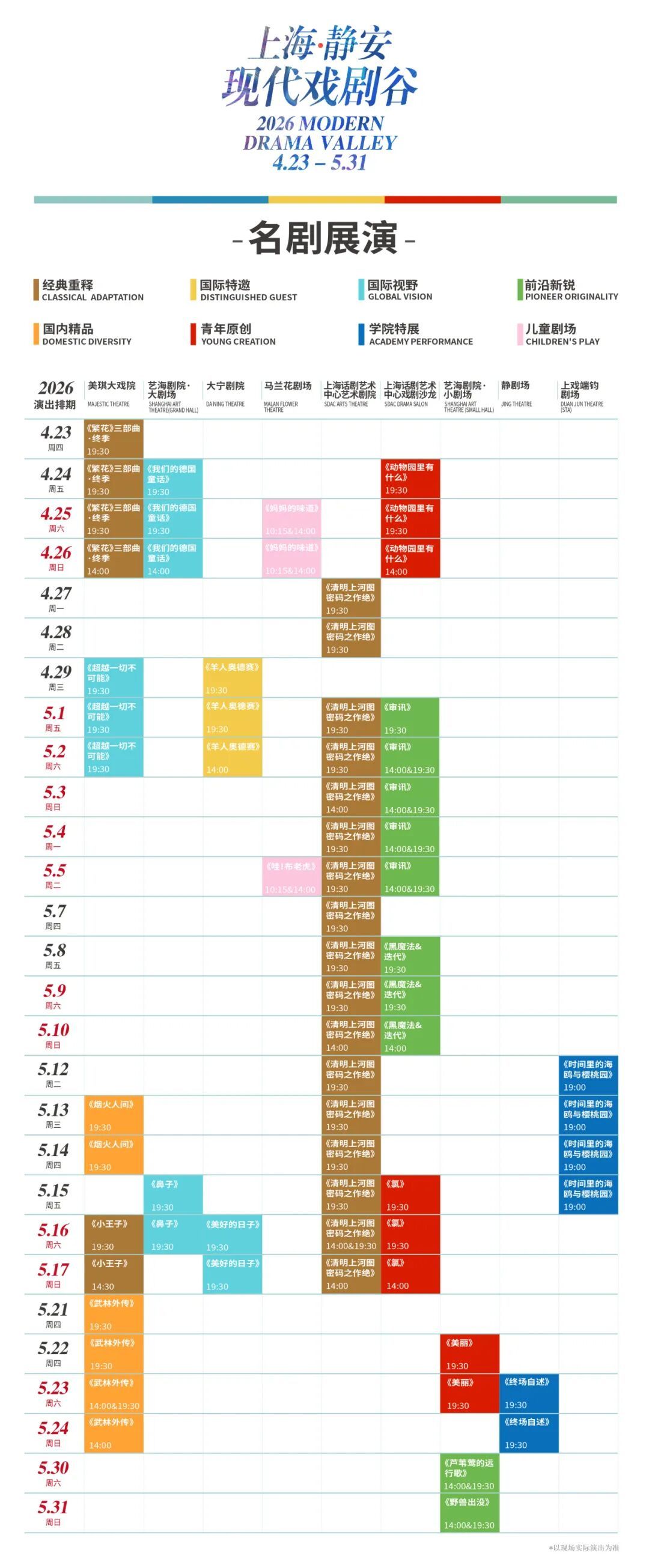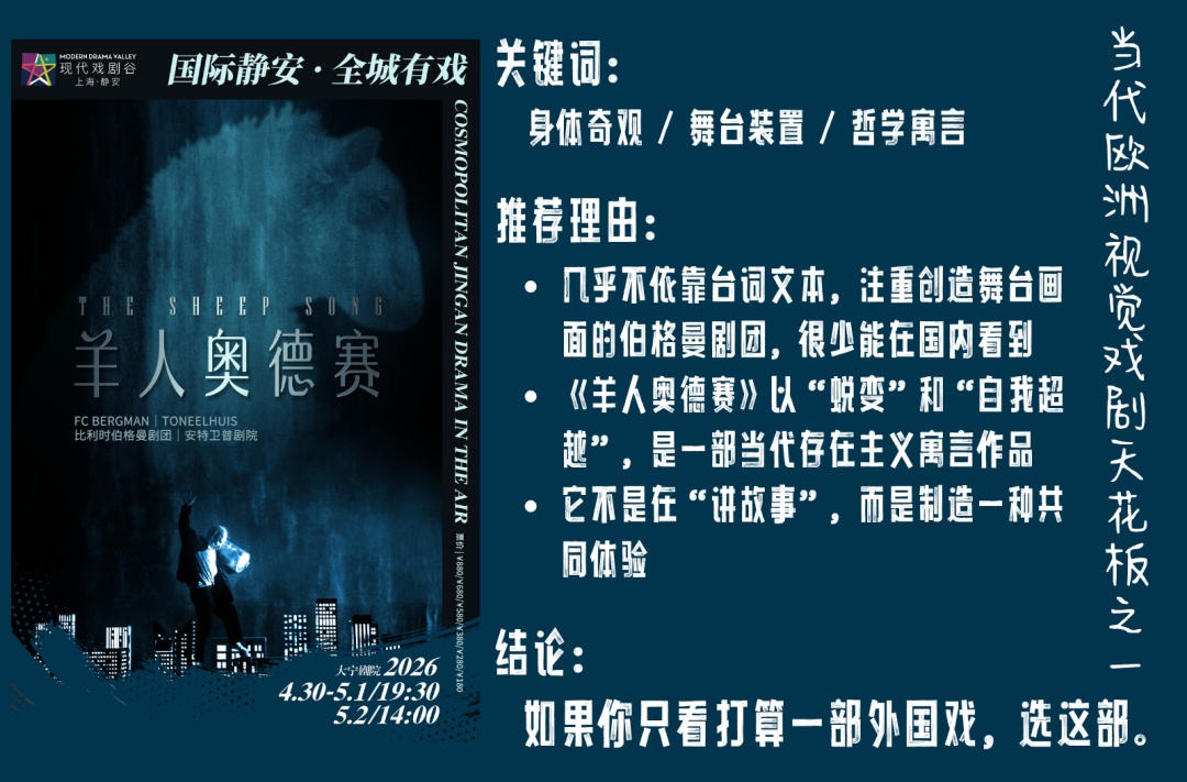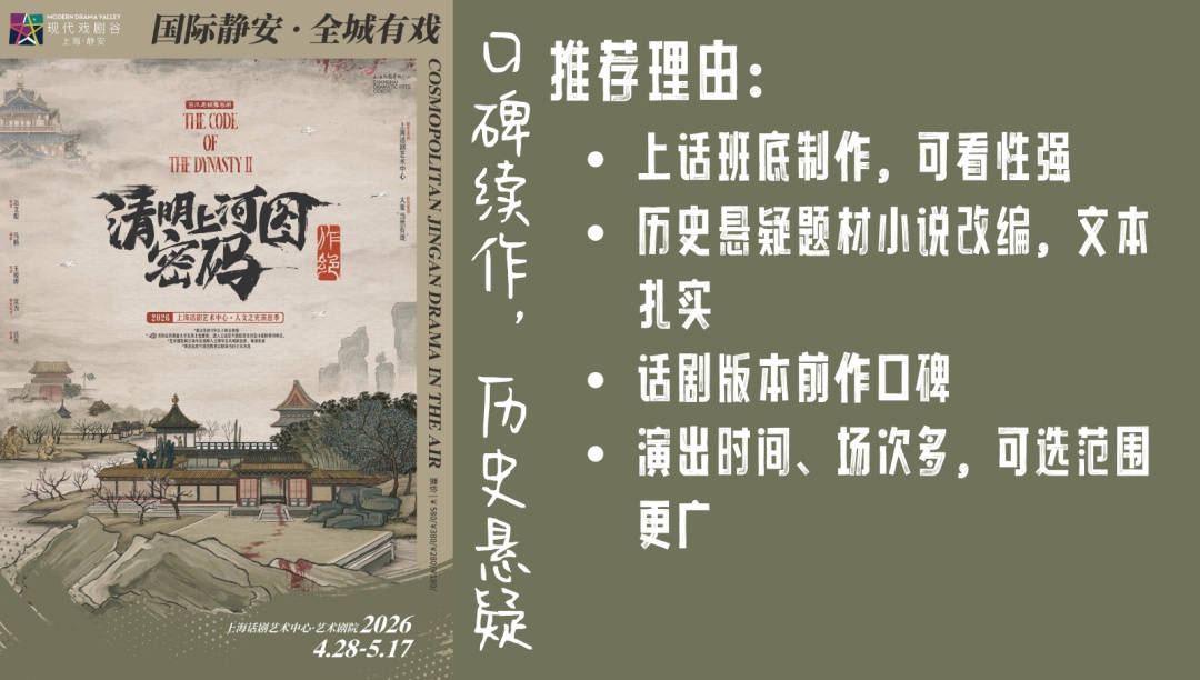 随着最后一批剧目陆续开票,2026上海·静安现代戏剧谷已经进入开幕倒计时,囊括海内外诸多精品的21部剧目在一个多月的时间里轮番上演。 长按或截图保存本次戏剧谷 完整版戏剧日历 由于囊括多个假日并且横跨“五一”小长假,不少演出日都不止一部剧目上演,并且覆盖了静安区内的多个剧院的大小剧场。 哪些是你的必看剧目? 哪些勾起了你的好奇心? 哪些是你的情怀之作? 哪些涉及你关注的话题? 我们请AI 以时间最优、冲突最少 且保证观演节奏合理 (尽可能每天不超过1场)为原则 制作了一份 囊括所有剧目 并且不撞档的高强度看剧攻略 *请长按图片或截图保存 能够高强度看剧的观众 毕竟在少数 建议依照自己个人偏好 进行一定程度的取舍 不要让走进剧院的珍贵体验 变成“完成任务”的负担 我们继续请AI依照 戏剧价值 和 现场体验不可替代性为原则 从(有点挑剔的)资深观众角度 进行推荐 下面是推荐列表 真正的“必看” 第一档:闭眼买 依据个人偏好选择 第二档:高质量 着重创造地域性文化语境 第三档:本土重点 特别推荐一 戏剧新生·力 结论:适合对此类议题有所关注、有戏剧节观剧 经验、相对偏专业的观众。 特别推荐二 童年限时·乐 结论:可作为亲子活动选择,适合对此类题材、形式有所关注的观众。 更多的海外名团、名导、名作 更丰富的剧目类型、表演风格 都是为了让你有机会 在有限的时间里自由选择 置身于戏剧的苍穹之下 感受舞台从未消减的魅力 扫描二维码 进入大麦专题页面 扫描二维码 进入猫眼专题页面 ✦ 已开票剧目 2026 MODERN DRAMA VALLEY ✦