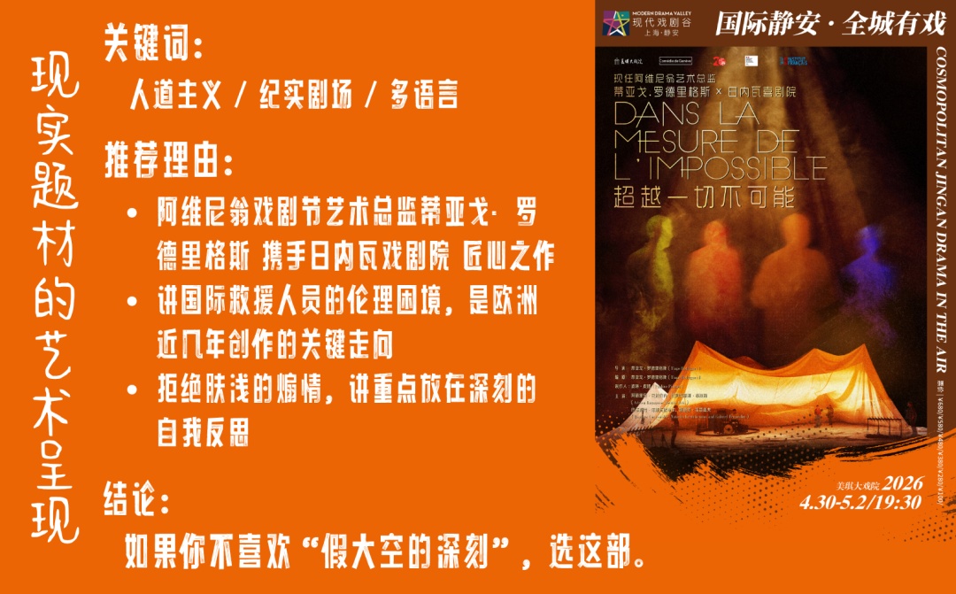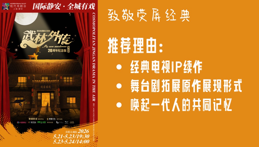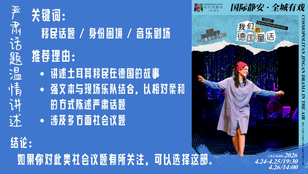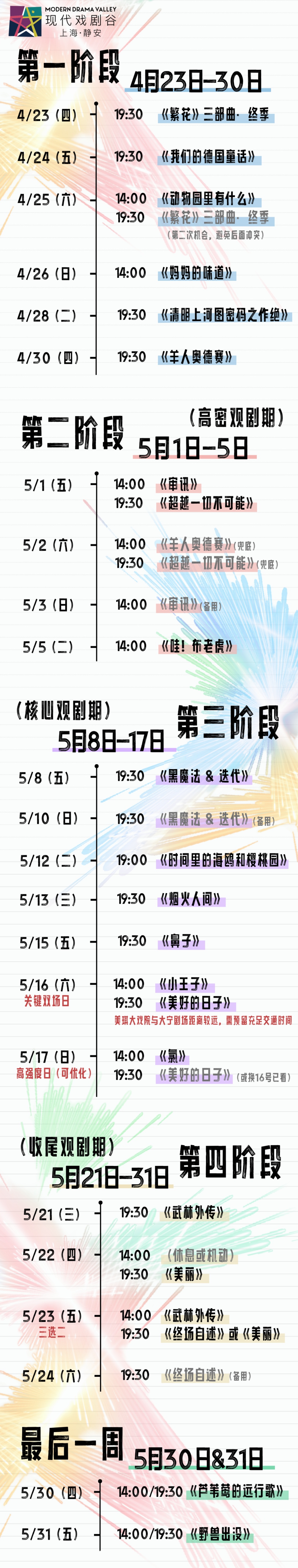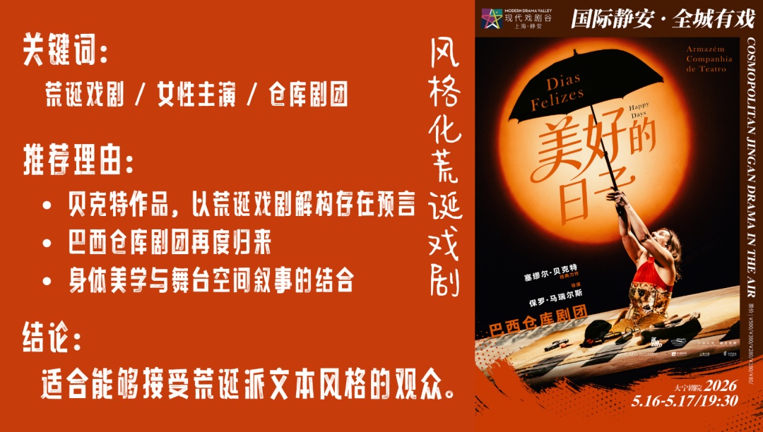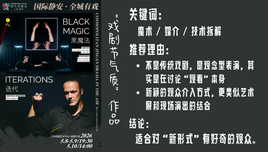 随着最后一批剧目陆续开票,2026上海·静安现代戏剧谷已经进入开幕倒计时,囊括海内外诸多精品的21部剧目在一个多月的时间里轮番上演。 长按或截图保存本次戏剧谷 完整版戏剧日历 由于囊括多个假日并且横跨“五一”小长假,不少演出日都不止一部剧目上演,并且覆盖了静安区内的多个剧院的大小剧场。 哪些是你的必看剧目? 哪些勾起了你的好奇心? 哪些是你的情怀之作? 哪些涉及你关注的话题? 我们请AI 以时间最优、冲突最少 且保证观演节奏合理 (尽可能每天不超过1场)为原则 制作了一份 囊括所有剧目 并且不撞档的高强度看剧攻略 *请长按图片或截图保存 能够高强度看剧的观众 毕竟在少数 建议依照自己个人偏好 进行一定程度的取舍 不要让走进剧院的珍贵体验 变成“完成任务”的负担 我们继续请AI依照 戏剧价值 和 现场体验不可替代性为原则 从(有点挑剔的)资深观众角度 进行推荐 下面是推荐列表 真正的“必看” 第一档:闭眼买 依据个人偏好选择 第二档:高质量 着重创造地域性文化语境 第三档:本土重点 特别推荐一 戏剧新生·力 结论:适合对此类议题有所关注、有戏剧节观剧 经验、相对偏专业的观众。 特别推荐二 童年限时·乐 结论:可作为亲子活动选择,适合对此类题材、形式有所关注的观众。 更多的海外名团、名导、名作 更丰富的剧目类型、表演风格 都是为了让你有机会 在有限的时间里自由选择 置身于戏剧的苍穹之下 感受舞台从未消减的魅力 扫描二维码 进入大麦专题页面 扫描二维码 进入猫眼专题页面 ✦ 已开票剧目 2026 MODERN DRAMA VALLEY ✦