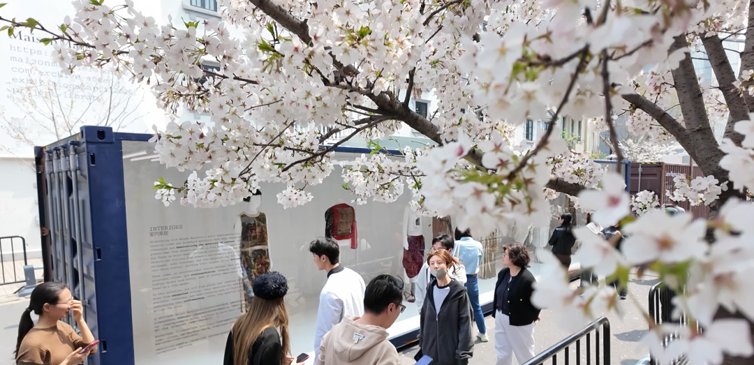 樱花树旁的集装箱式展柜错落排布