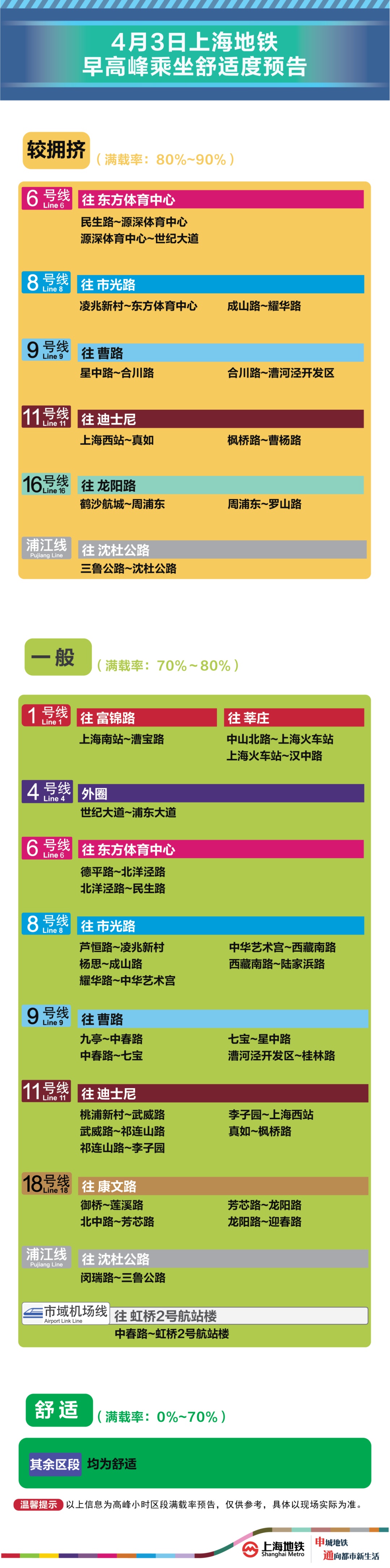 为提升上海地铁早高峰期间出行服务水平,提升乘客乘坐体验,上海地铁向乘客提供乘坐舒适度预告,方便乘客提