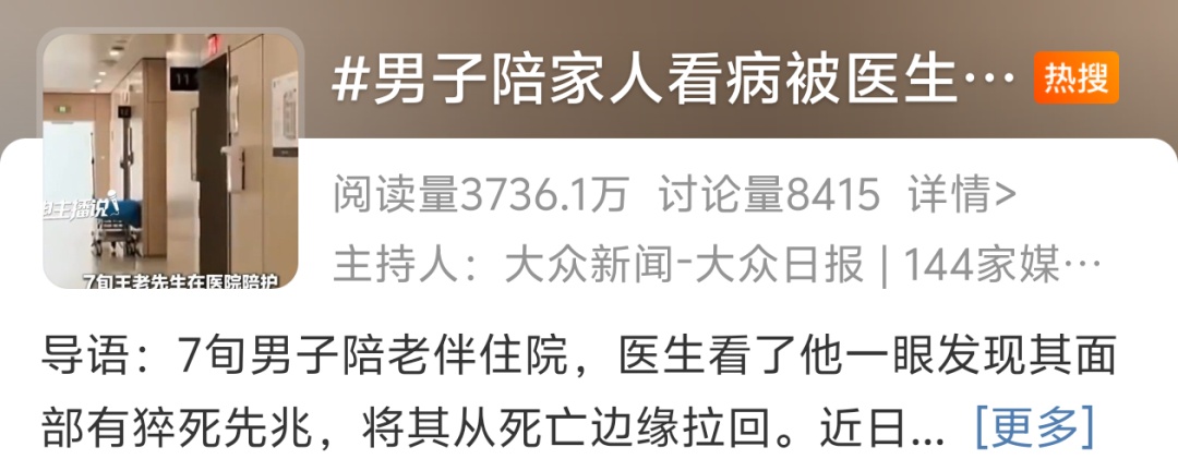 近日,江苏南京一位七旬老人陪护住院的老伴,主治医生查房时,仅仅是“看了他一眼”,就立即建议他去做检查,结果查出其心脏主要血管狭窄程度高达99%,极易导致心肌梗死或猝死。