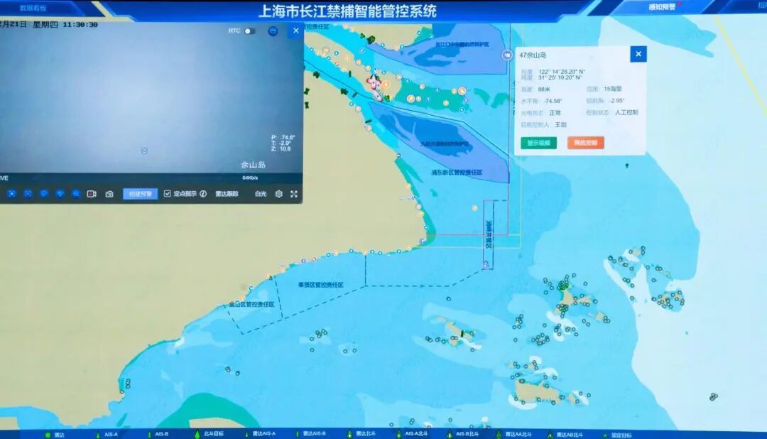 在全国率先建成的长江禁捕智能管控系统,正是这一转型的核心支撑。走进指挥中心,在上海市长江禁捕智能管控系统大屏上,整合了沿江各区的存量信息资源,新建116个感知点位,利用小目标雷达、AIS、北斗、光电摄像机等感知设备,建成覆盖3200平方公里禁捕水域、450公里沿江岸线、365天24小时全水域全天候的“水、陆、空、天”一体化管控网络。