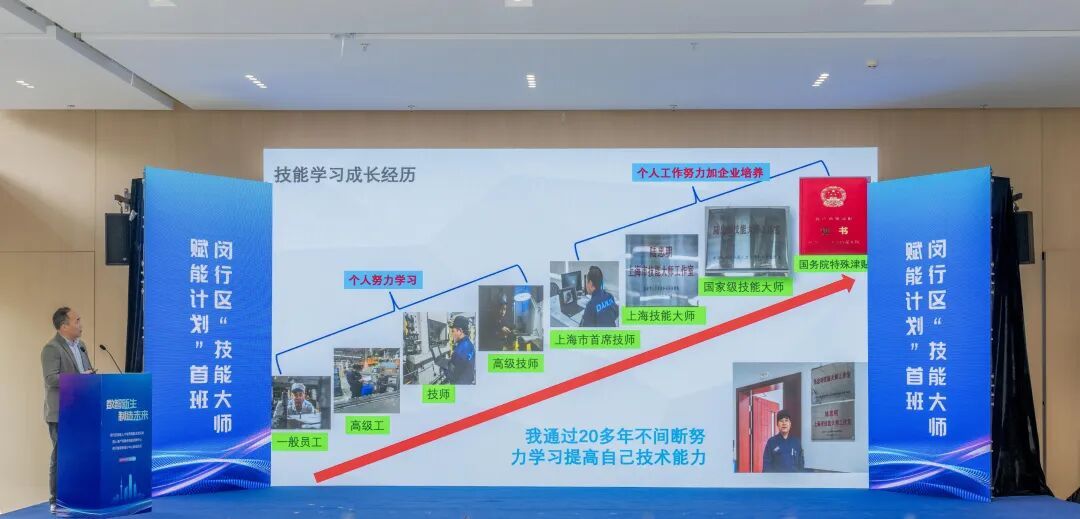 “技能大师赋能计划”首班同步开讲,全国劳模、国家技能大师、全国技术能手陆忠明分享了个人成长的故事,他期待能在各个街镇组建讲师团,通过专题研讨、主题讲座等丰富形式,为闵行特色技能品牌培育和产业技能人才队伍建设贡献力量。