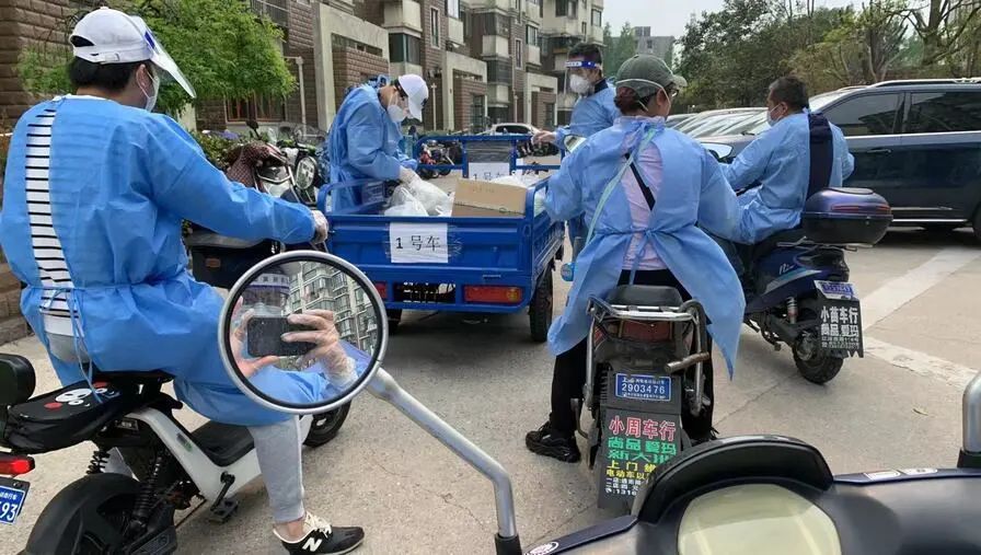 一辆电动三轮车出发,后面要跟上四五个志愿者一起配送。有很多人家里的门铃坏了,我们只能靠嗓子喊。小区一圈兜下来,至少半个小时。就是这样:两辆三轮车,七八辆电瓶车,十多个志愿者,送着每小时上百件源源不断送进来的快递、外卖、团购物资。