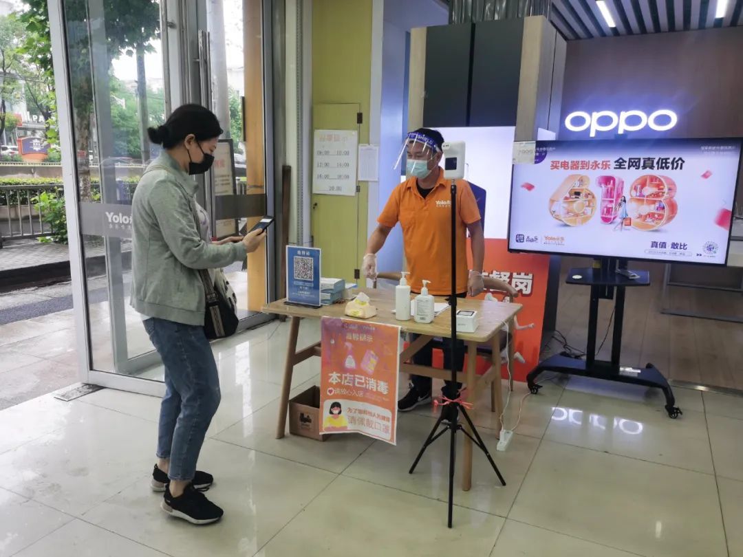 今天(6月13日)是工作日,仍有不少市民来到永乐嘉定店选购商品。在商场入口处,每名顾客必须经过测量体温、扫描场所码、出示72小时核酸阴性证明后方可进入。在环境安全方面,店内由专人负责,每两个小时进行一次全面消毒。