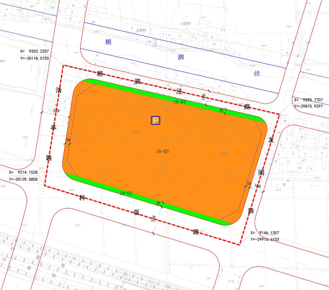结合顾泗泾景观廊道,同时落实近期重点产业项目,拟将10-01地块进行切分,在基地北侧沿顾泗泾路布置公共绿地,形成公共开放空间。
