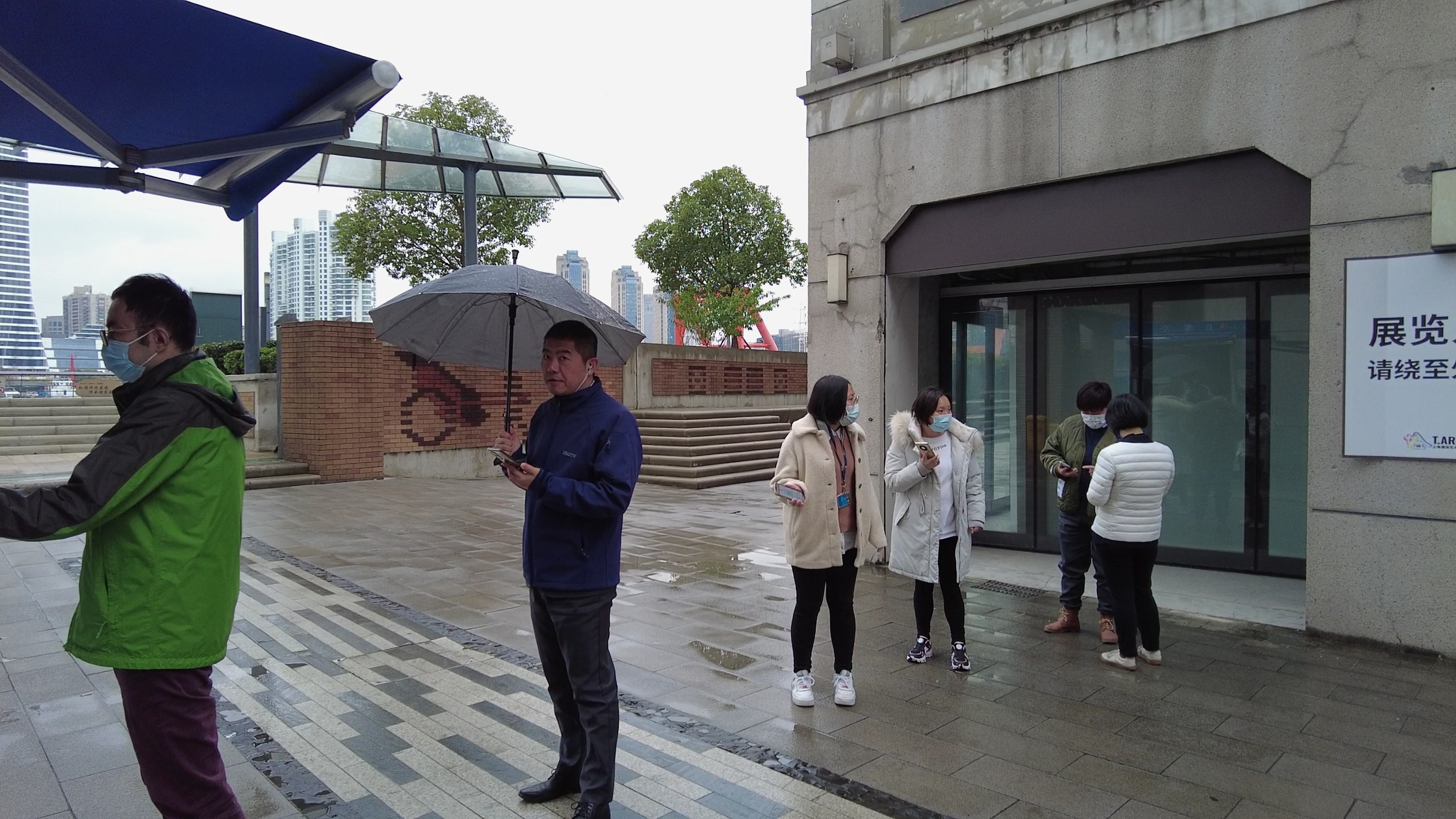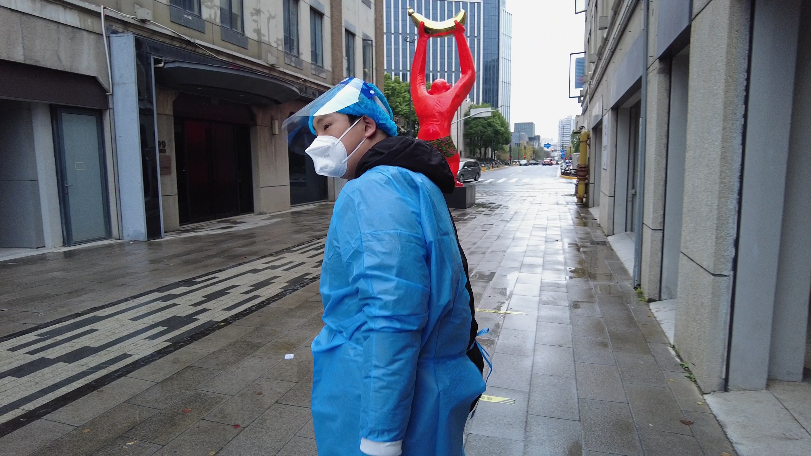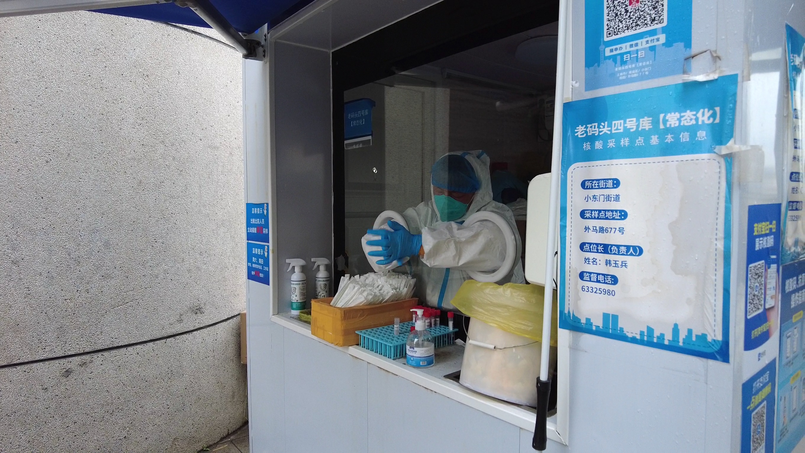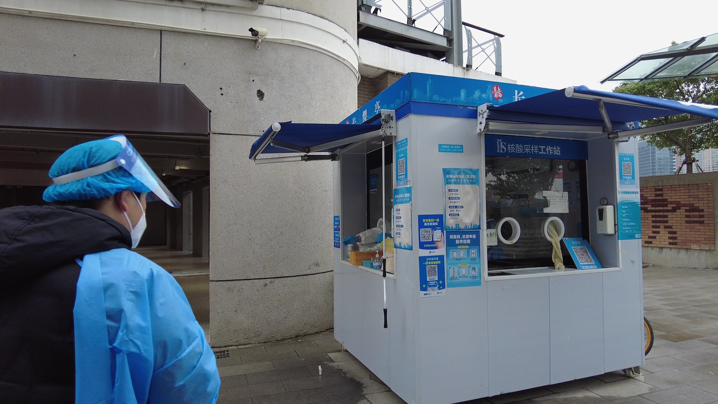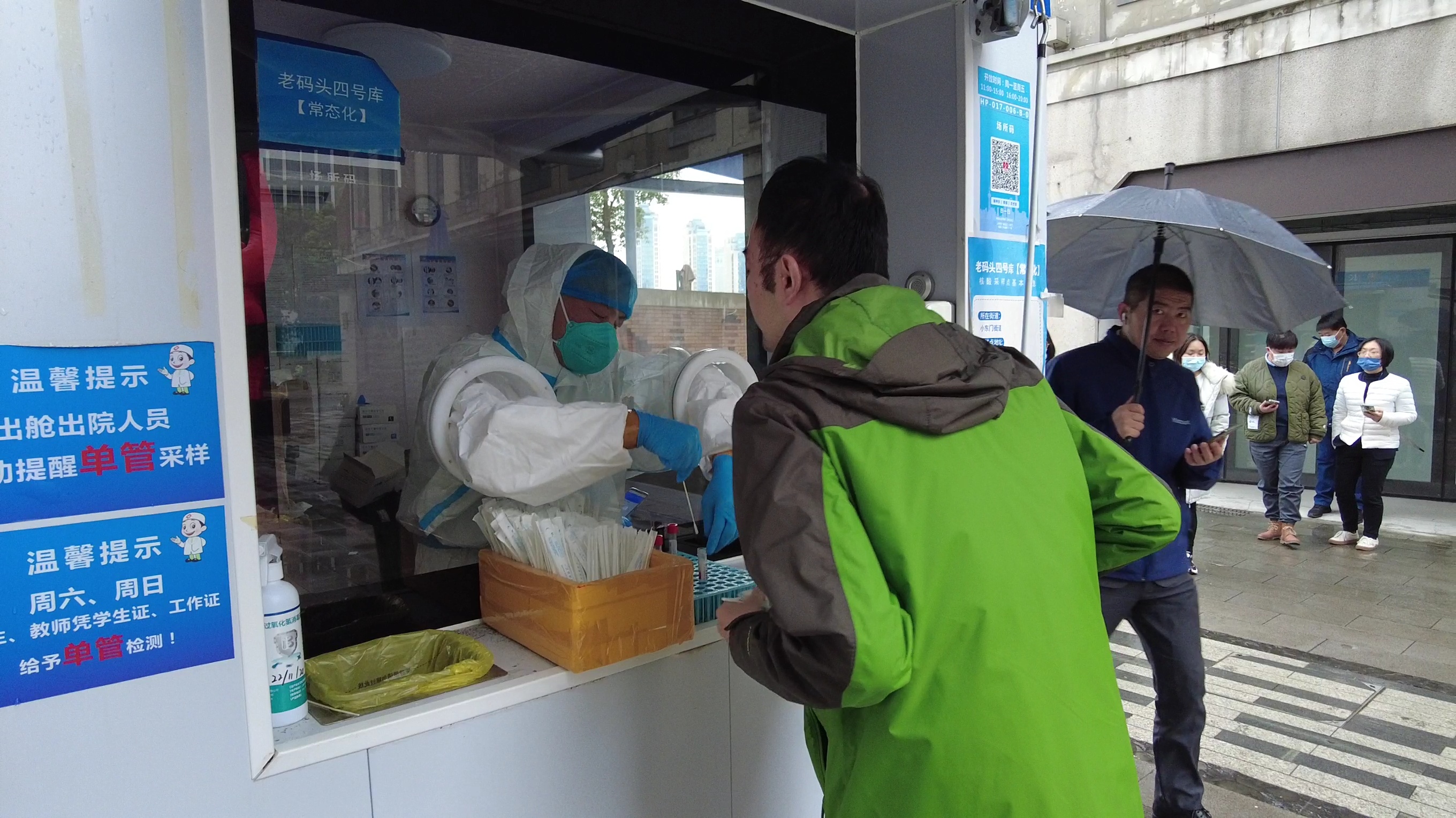 在位于外马路黄浦江边上的一个核酸采样亭,工作人员小普不断的为前来做核酸的市民提供指引和提醒。小普所在的核酸点靠近江边,为了尽可能地保暖,他在蓝色防护服下穿了好几件衣服,还有厚厚的外套,中午的时段,不断会有周边的上班族前来做核酸,小普就会一直站在亭外负责引导。