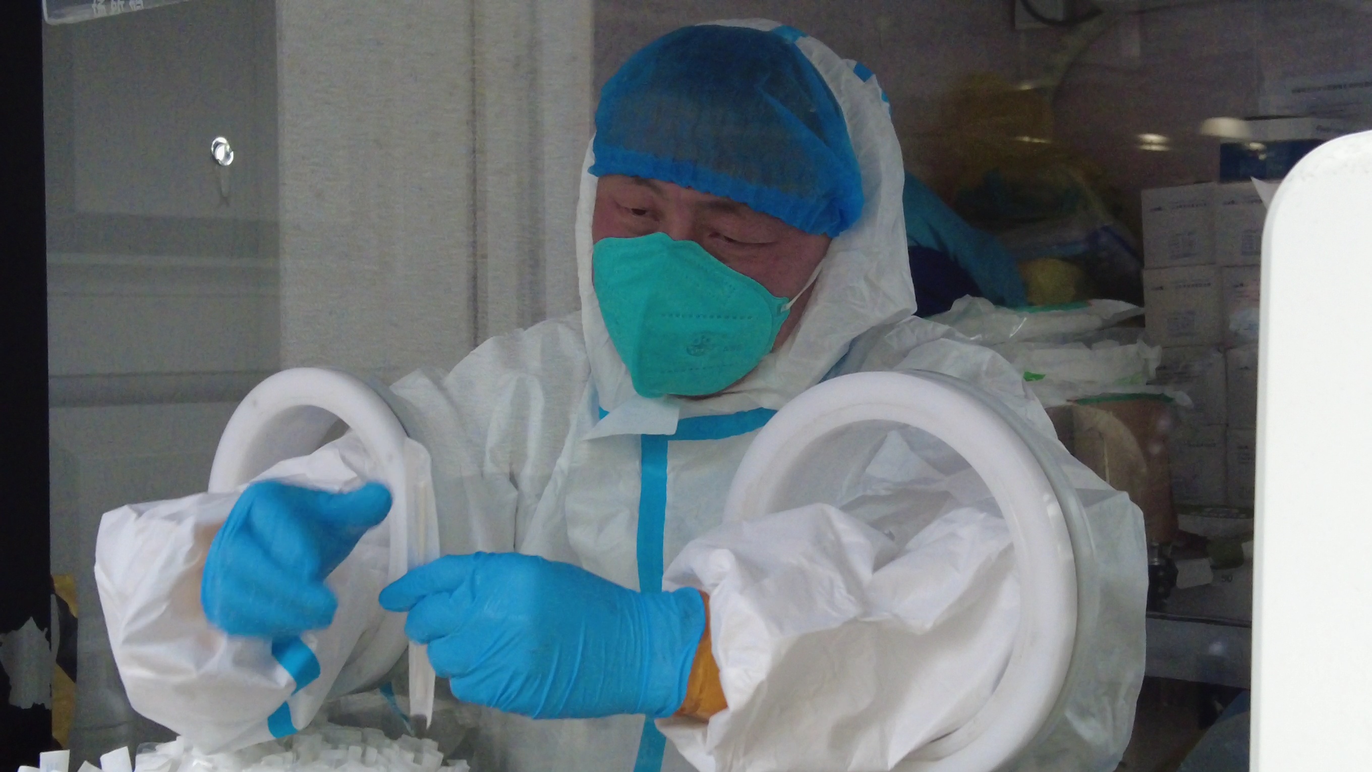 同样在这个亭子里的小顾,专门负责采样的工作,他的两个手从亭子内伸出,拆棉签,摆放采样管,每做完一个人就用酒精擦拭双手,全部动作都是暴露在室外,即便是带着两层手套,但每当有风吹过沾满酒精的双手,冷飕飕的感觉就会传遍全身。