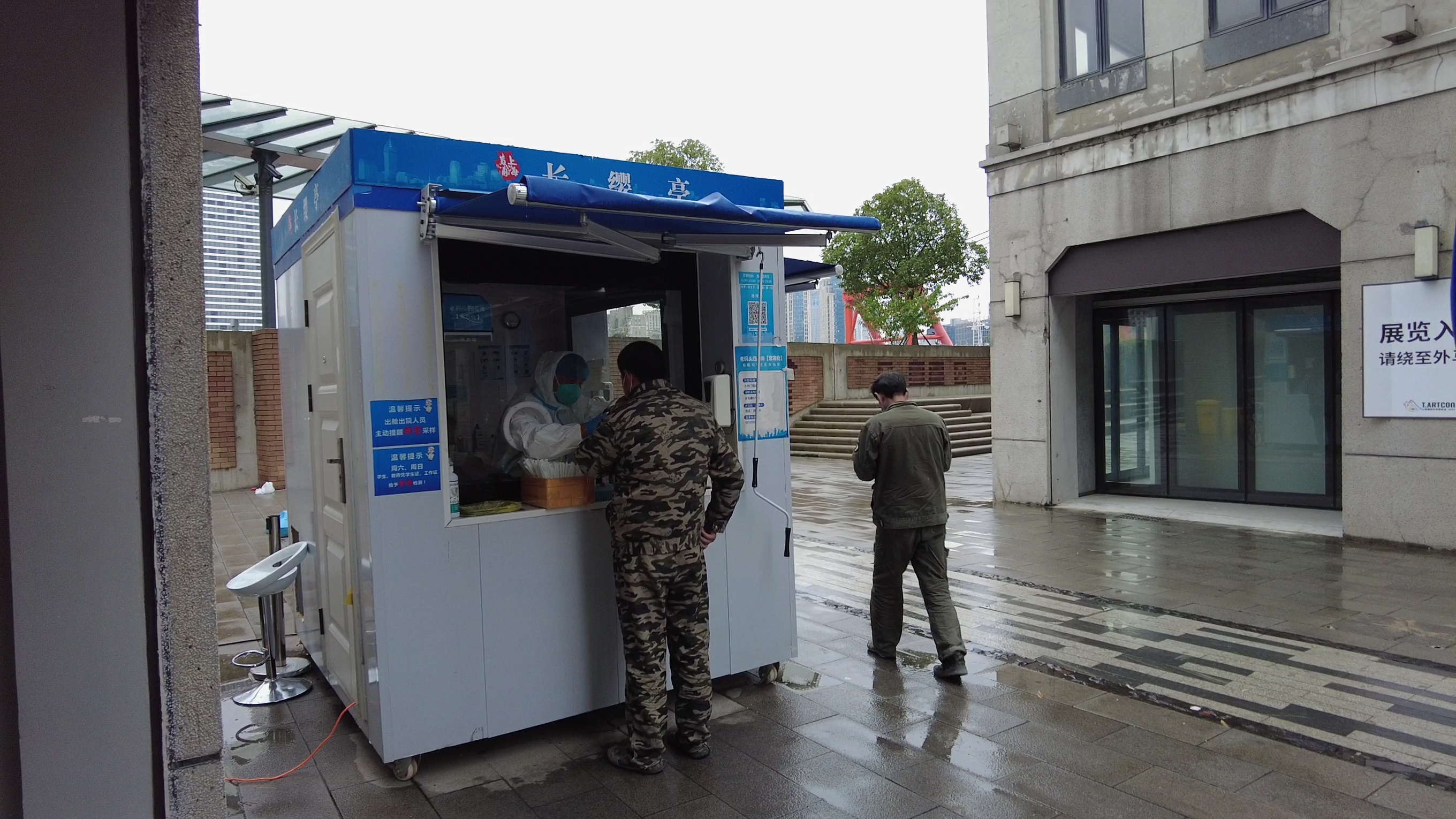 每隔一个小时,小普会与同事小李换班,这样小普就可以坐进开着热空调的亭子里,负责为前来做核酸的市民扫码。不过小李告诉记者,虽然亭子里开着空调,总体是热的,不过江边风大,不时就会有风从扫码口灌进来,所以坐在里面也没办法脱衣服,还是得裹得严实一些。