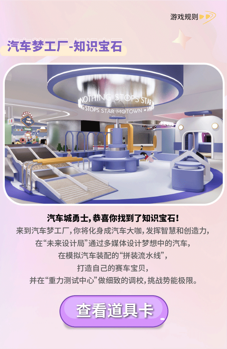 这是一款线上+线下相结合的主题探馆互动活动,参与者扫码1楼到3楼展厅内的4个活动立牌,并按照活动提示集齐隐藏在馆内的4颗能量宝石,重现美丽的汽车城 — MAGIC MOTOWN摩都!