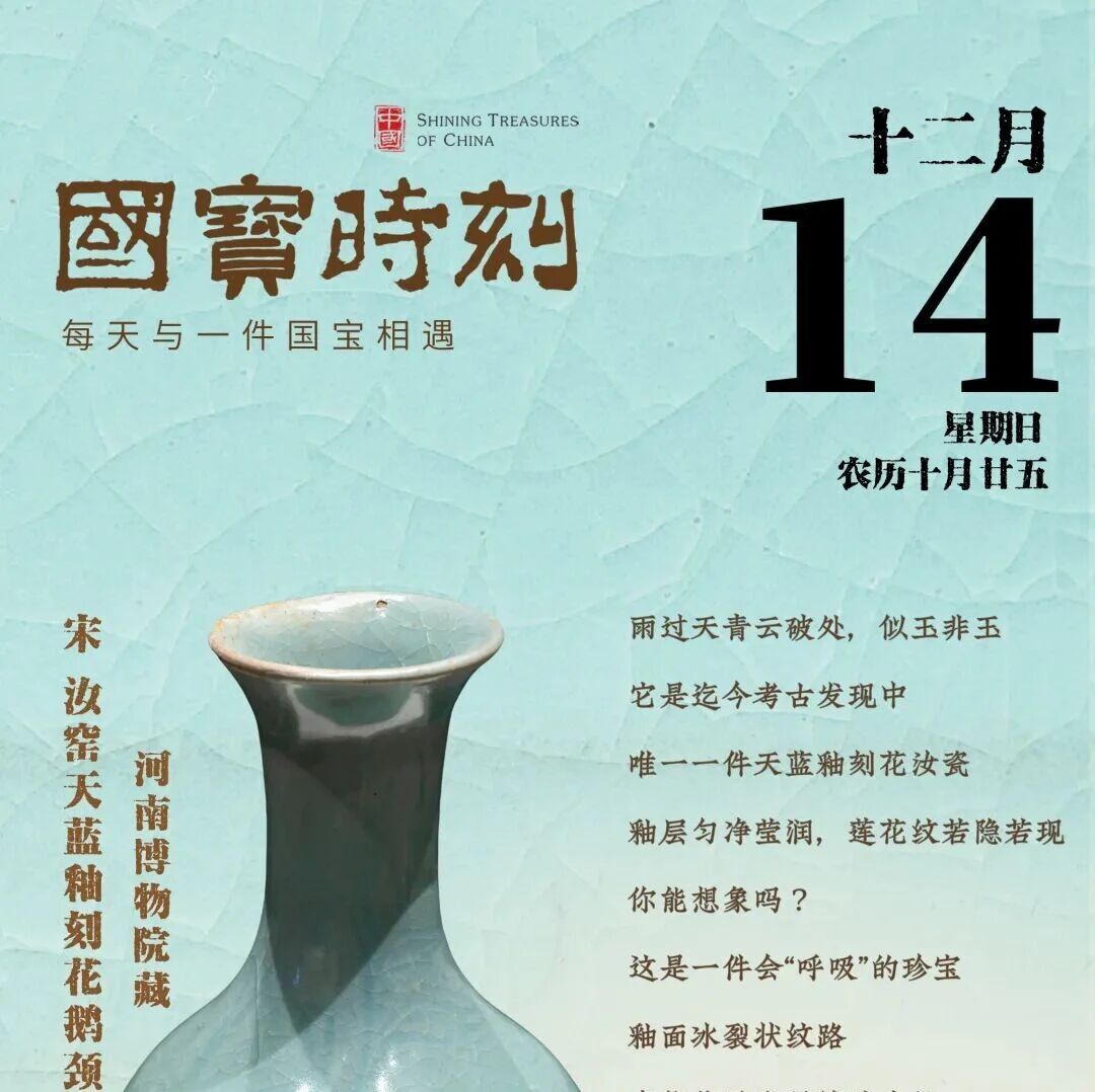 每天与一件国宝相遇!《国宝时刻・汝窑天蓝釉刻花鹅颈瓶》邂逅北宋窑火里的天青绝色