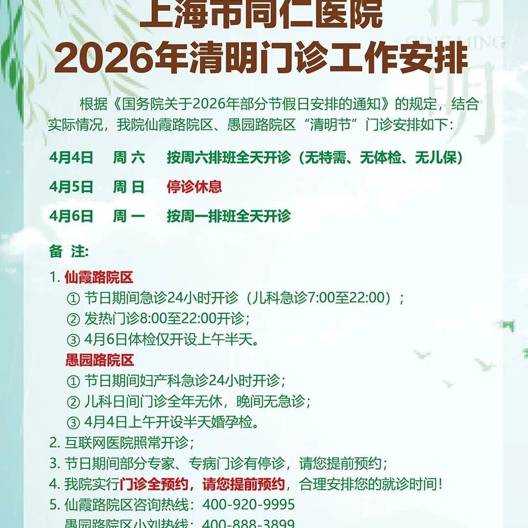【通知】上海市同仁医院2026年清明门诊工作安排